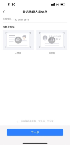在“商户进件”模块中提供了“认证为代理人”的入口,代理人需要在该界面下完成身份证的拍摄和身份信息的确认,确保姓名、证件号、登录手机号与受邀登记的代理人信息保持一致方可完成认证。