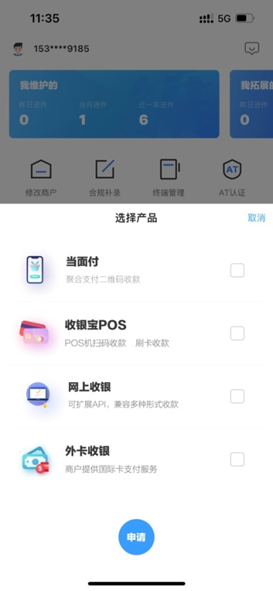 根据商户的性质和需求,可以选择当面付(微信、支付宝、银联扫码、外卡扫码支付、通联钱包)、收银宝(消费、扫码预消费、微信、支付宝、银联扫码支付、通联钱包)、网上收银(扫码预消费、微信、支付宝、银联扫码支付)以及外卡收银(消费、预授权)的产品组合发起进件申请。