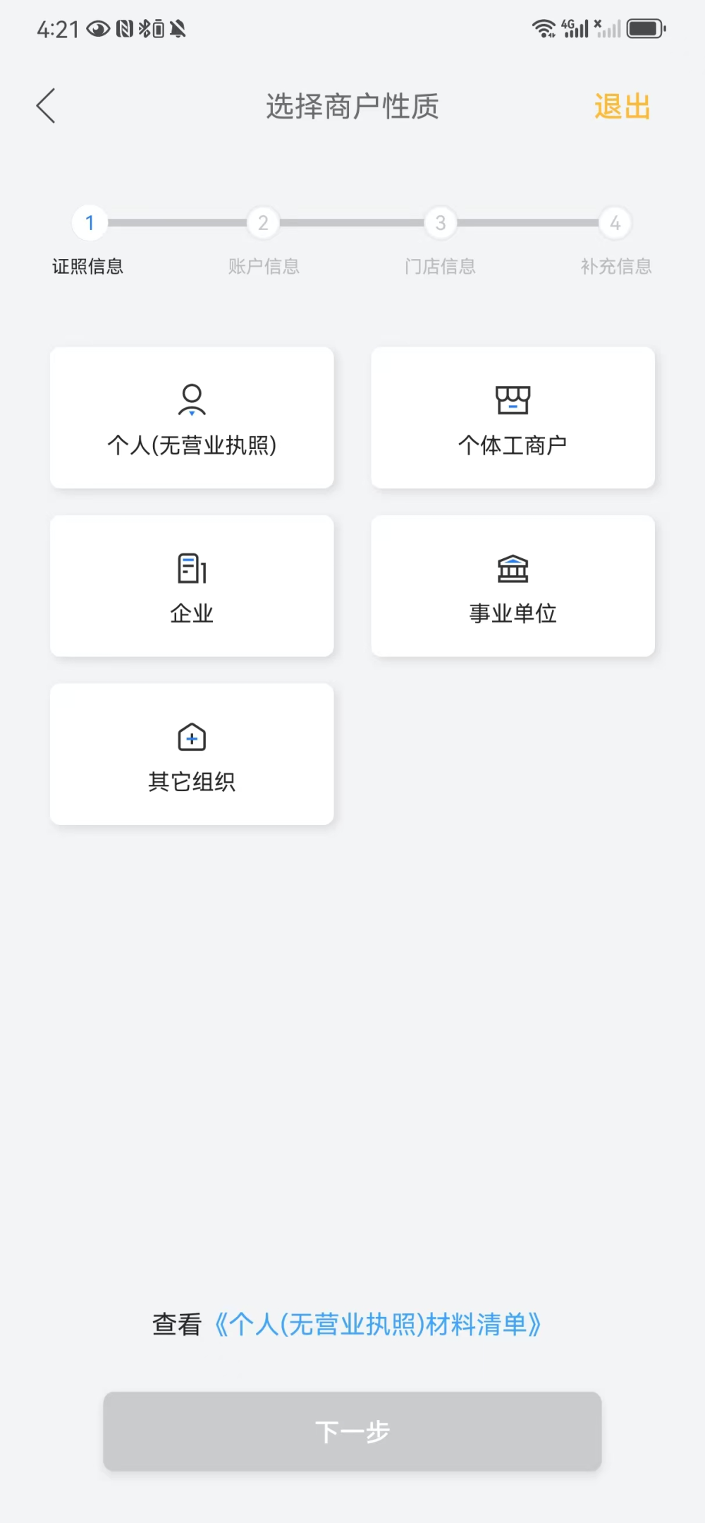 根据商户持有的证照情况选择对应的商户性质。其中提供营业执照入网可的以获得更高的交易限额。