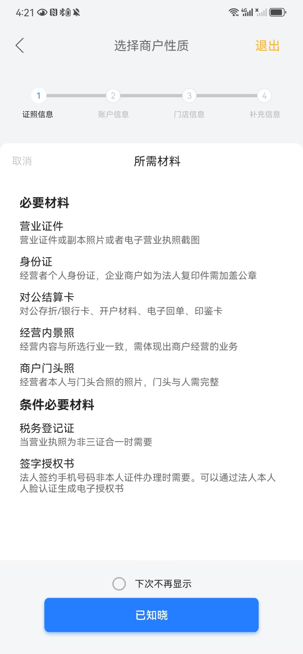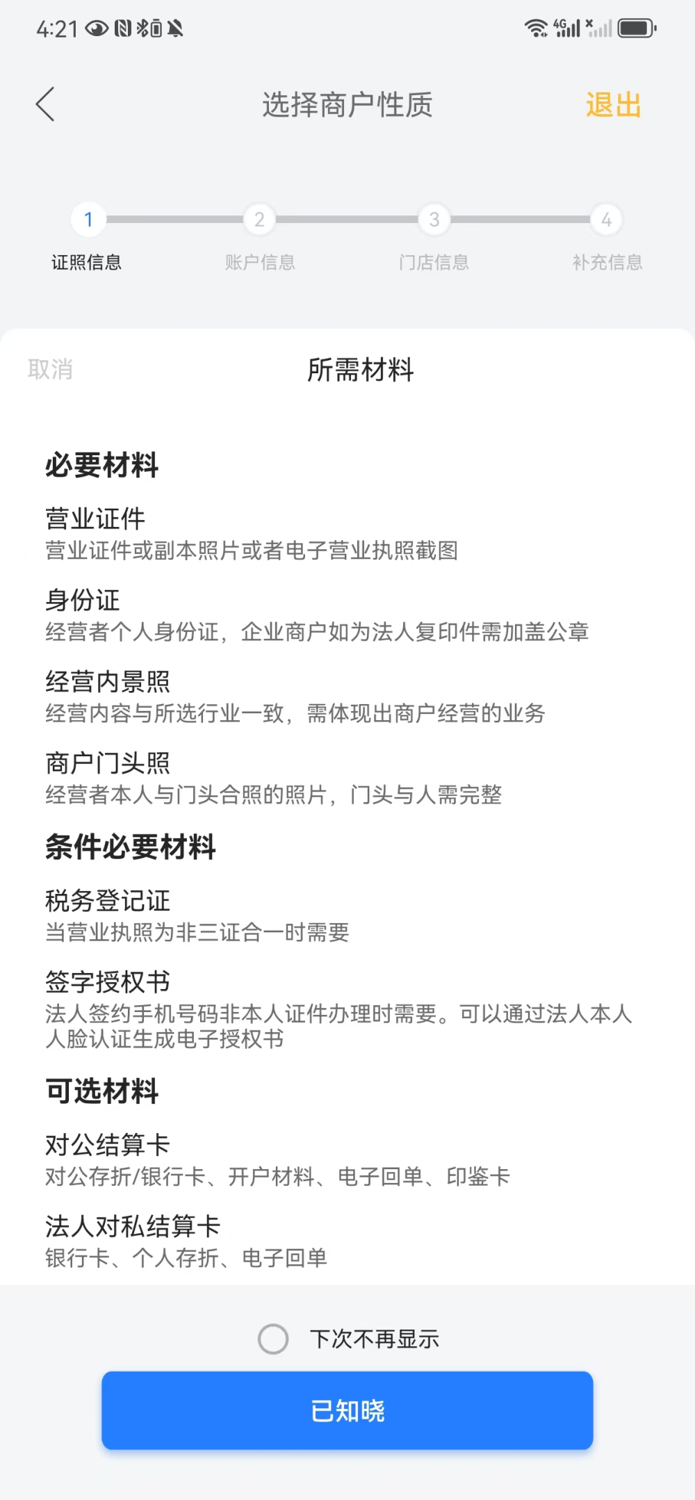 入网信息采集一共分为基本信息、证照信息、结算账户信息、经营信息、补充信息四个步骤。依据不同的商户性质和申请的产品不同,采集的信息可能略有差别,具体可以根据入网申请过程中界面上的提示信息逐一完成。