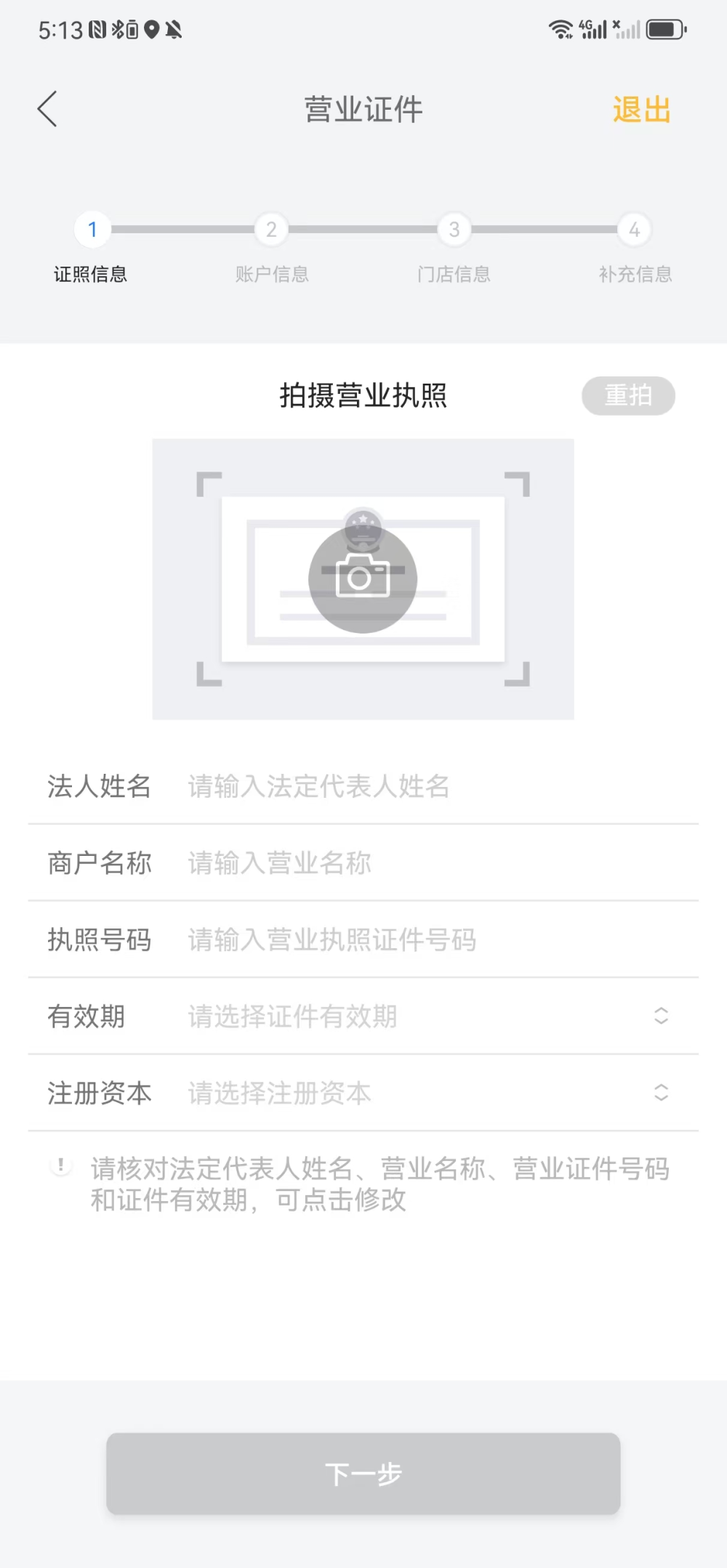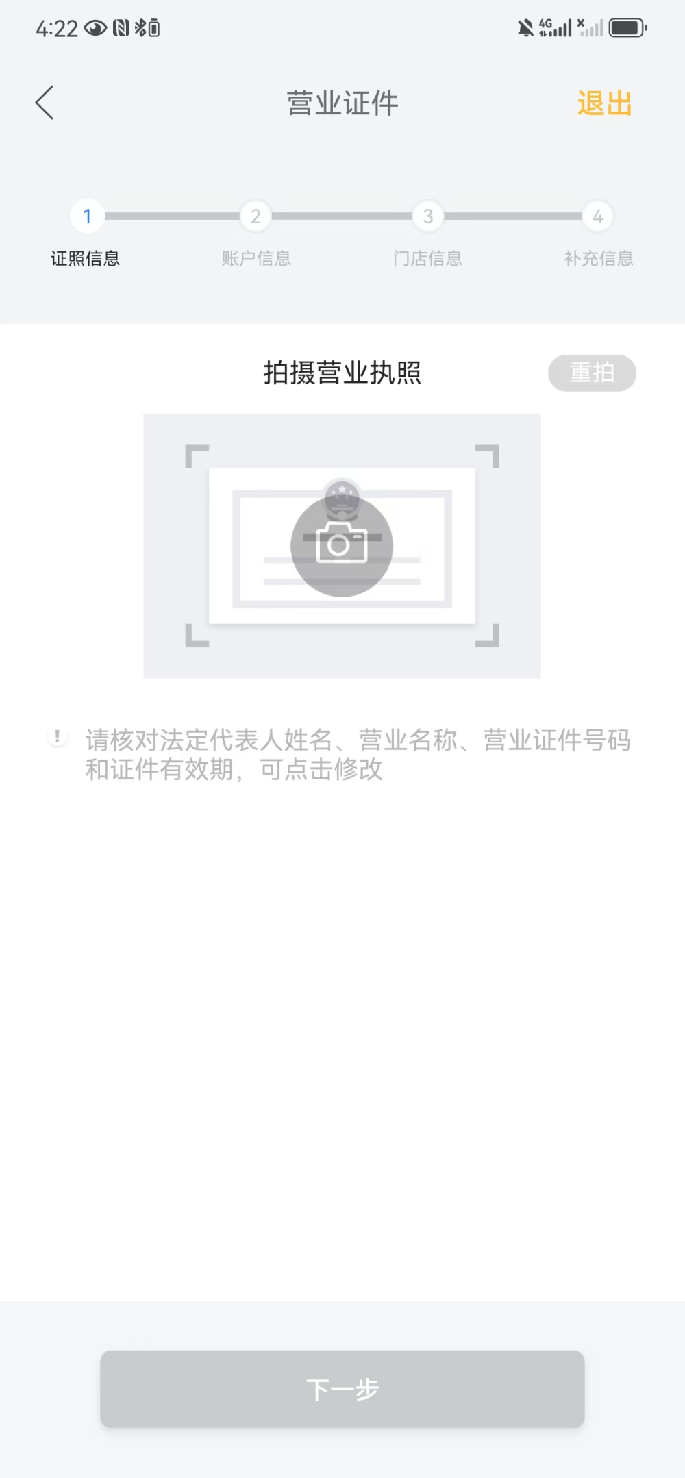 图像识别有误导致提交的营业执照信息号不正确,需检查提交的【法人姓名】【企业名称】【营业执照号】,是否与实际照面上的信息一致,修改后提交;