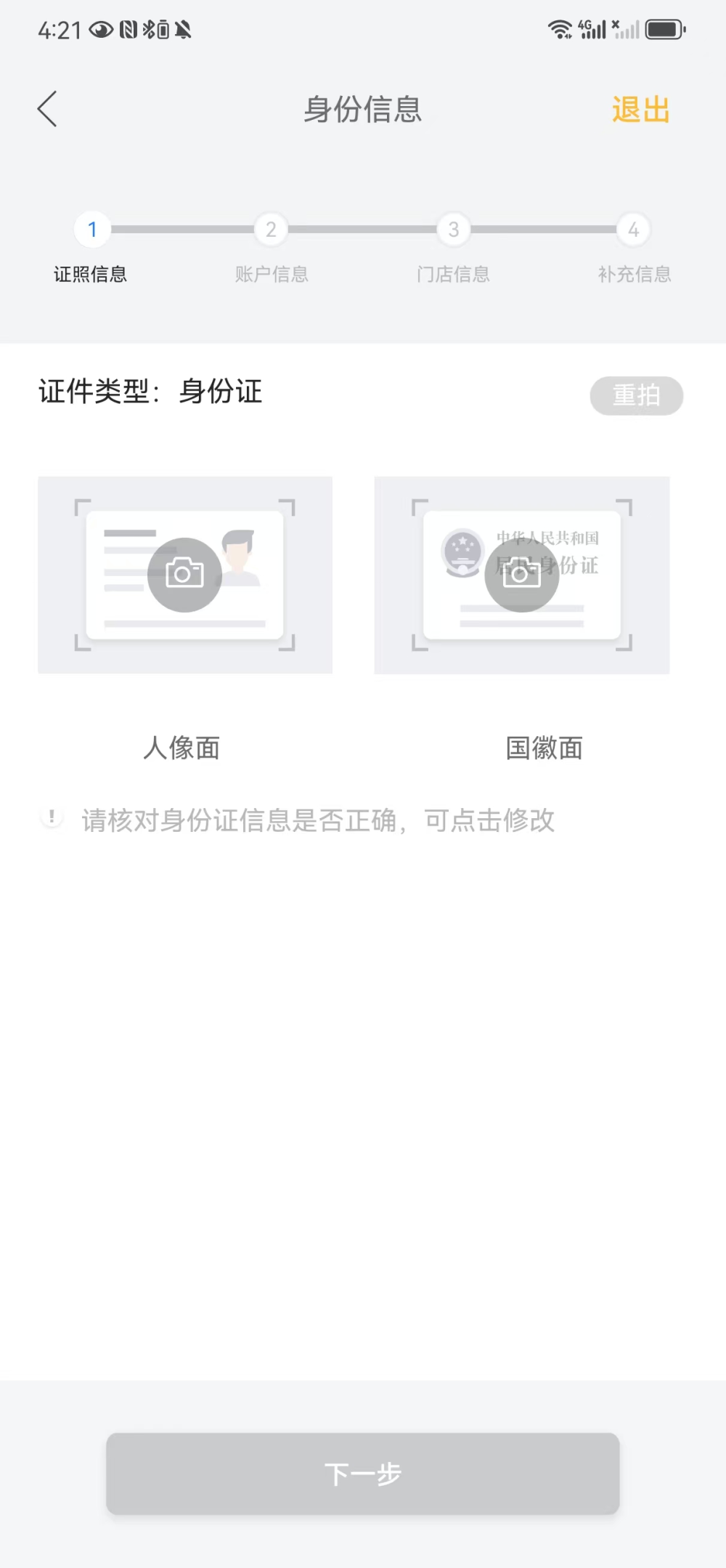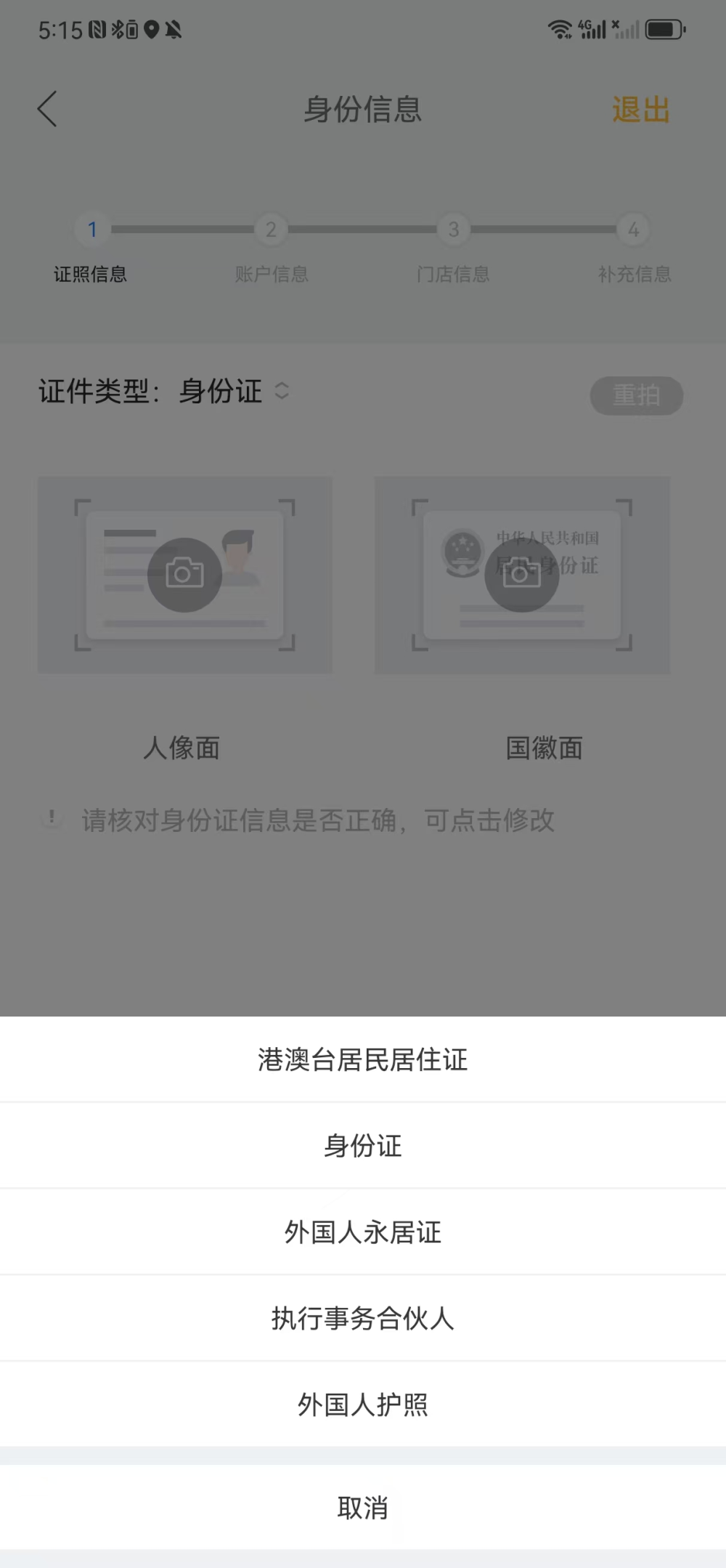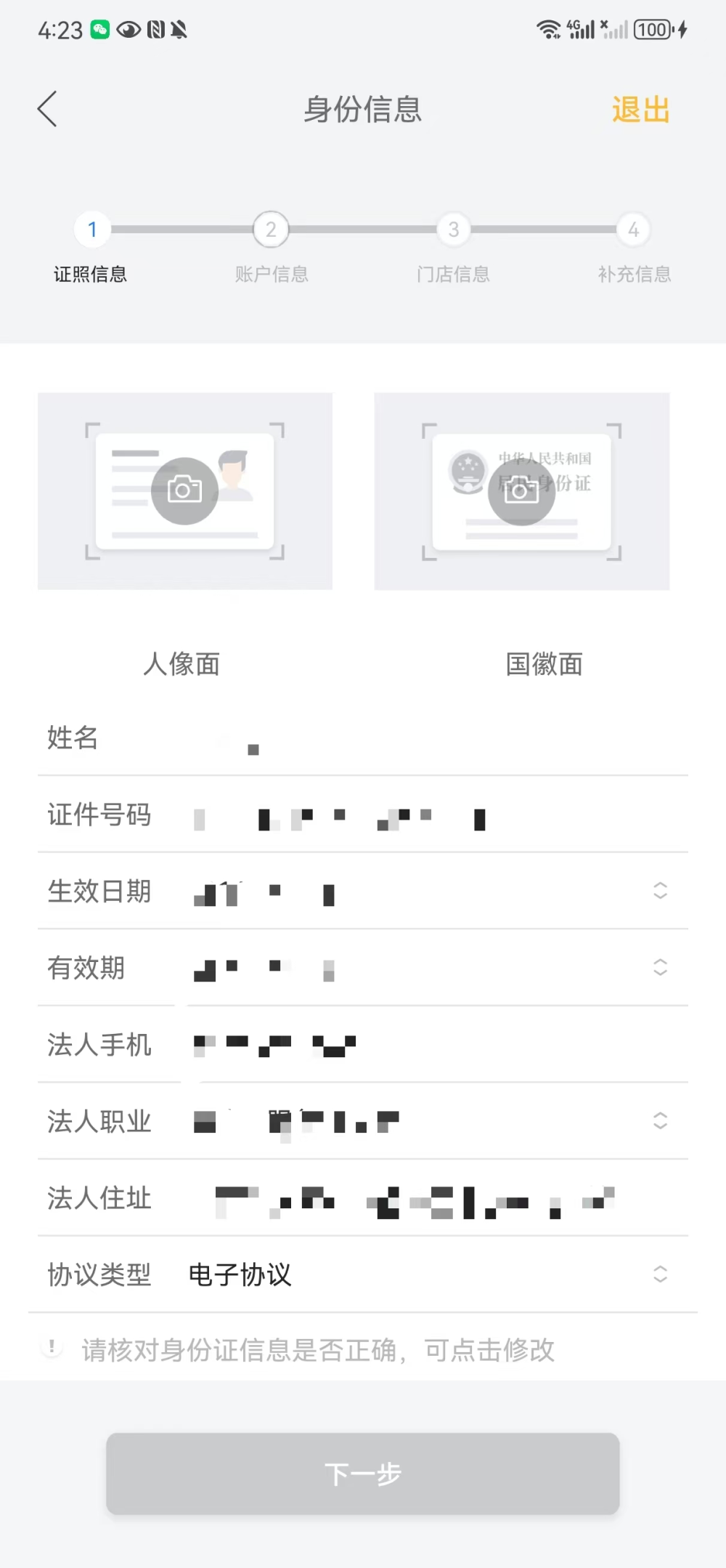 经营者身份信息需要根据所选的证件类型,拍摄有效身份证件照片,系统会自动根据上传的照片进行识别并显示,如果系统识别得部分信息有误,可以人工修改。如果系统识别失败,建议重新拍摄上传。
