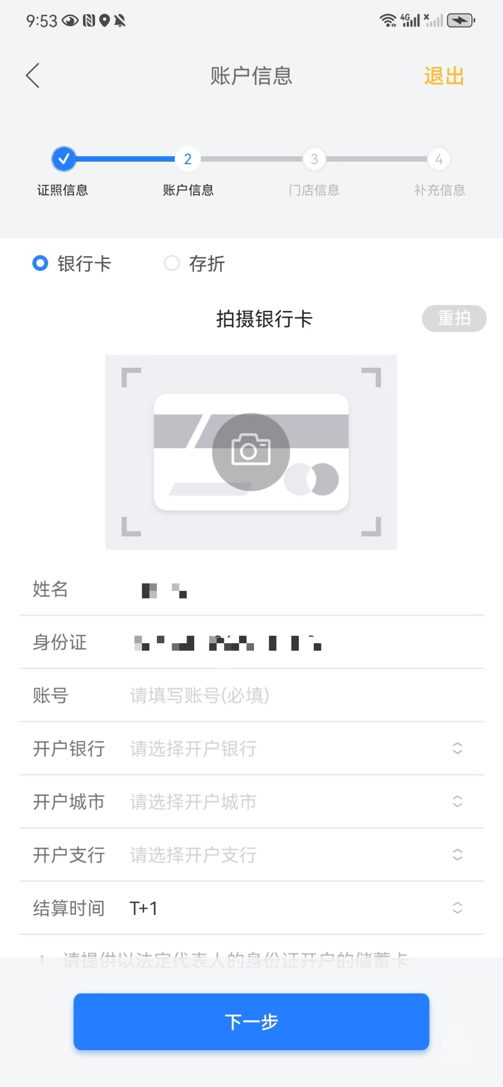 - 选择对私结算,需要拍摄银行卡并录入银行卡信息。拍摄的银行卡信息会由系统进行图像识别,识别的结果可以修改。需要另外补充银行卡对应的开户行,所在城市和支行信息。