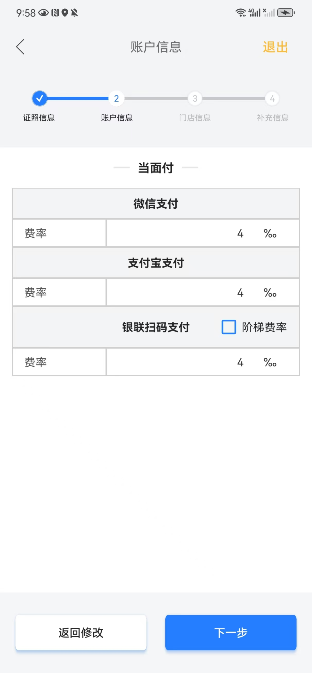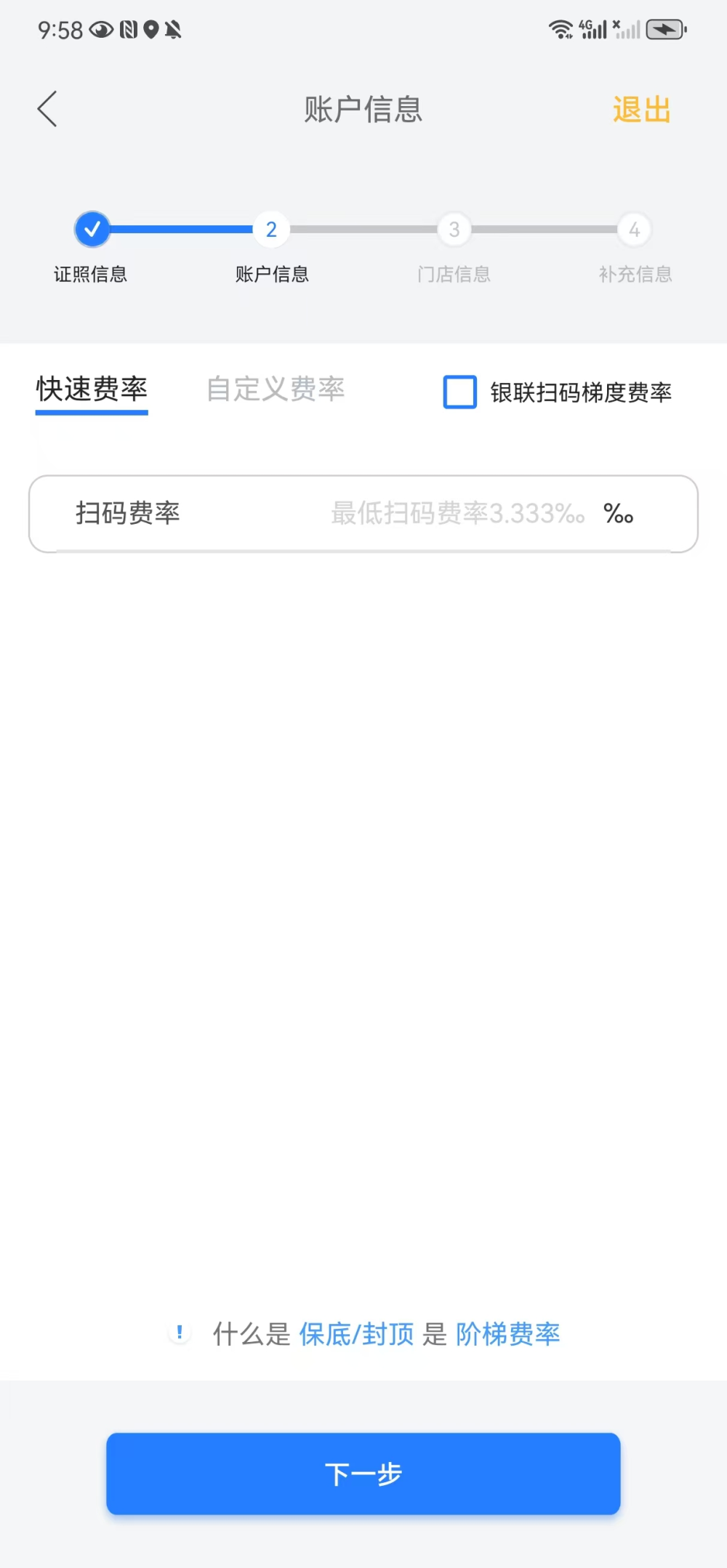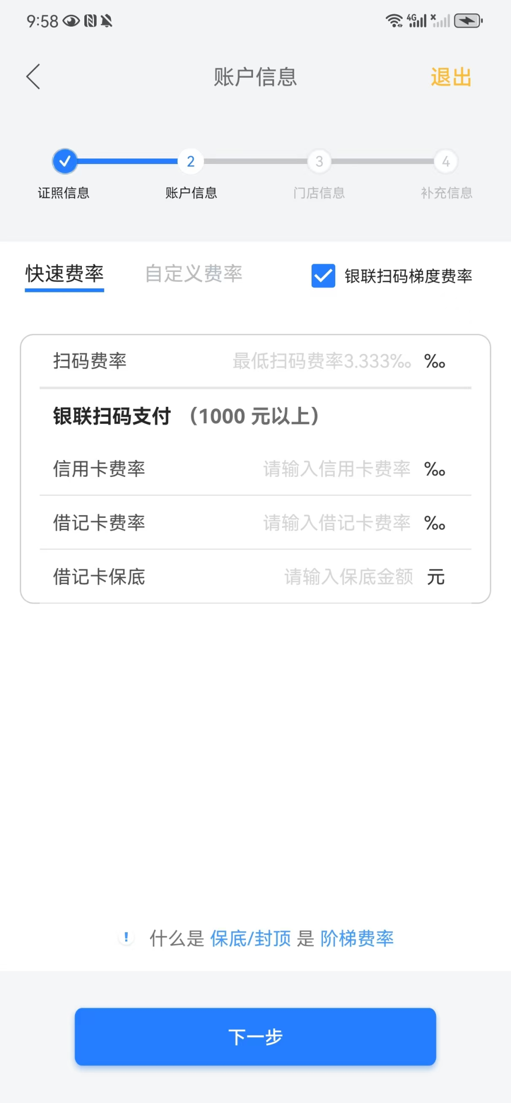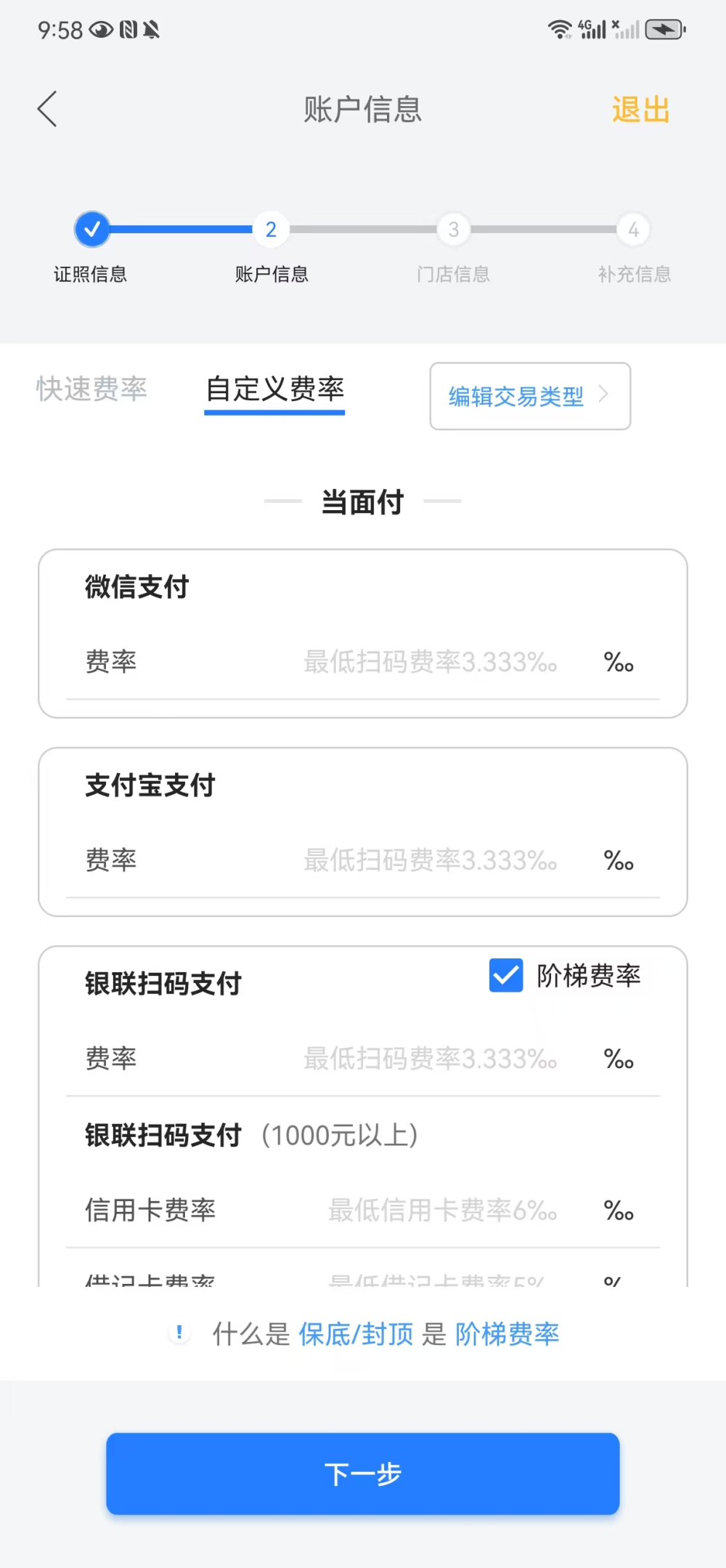- 签约费率现支持快速费率以及自定义费率两种填写模式,为商户提供的实际费率(千分比),请根据实际情况填写,两种填写模式均支持银联扫码阶梯费率,目前仅设置一档阶梯费率,即交易金额大于1000元的档位。