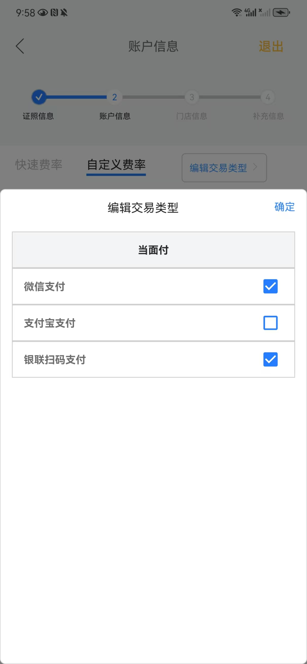 - 用户也可以根据商户实际需要,在自定义费率-编辑交易类型栏目,在客户经理所属机构开通的产品范围内重新选择商户需要的交易类型。