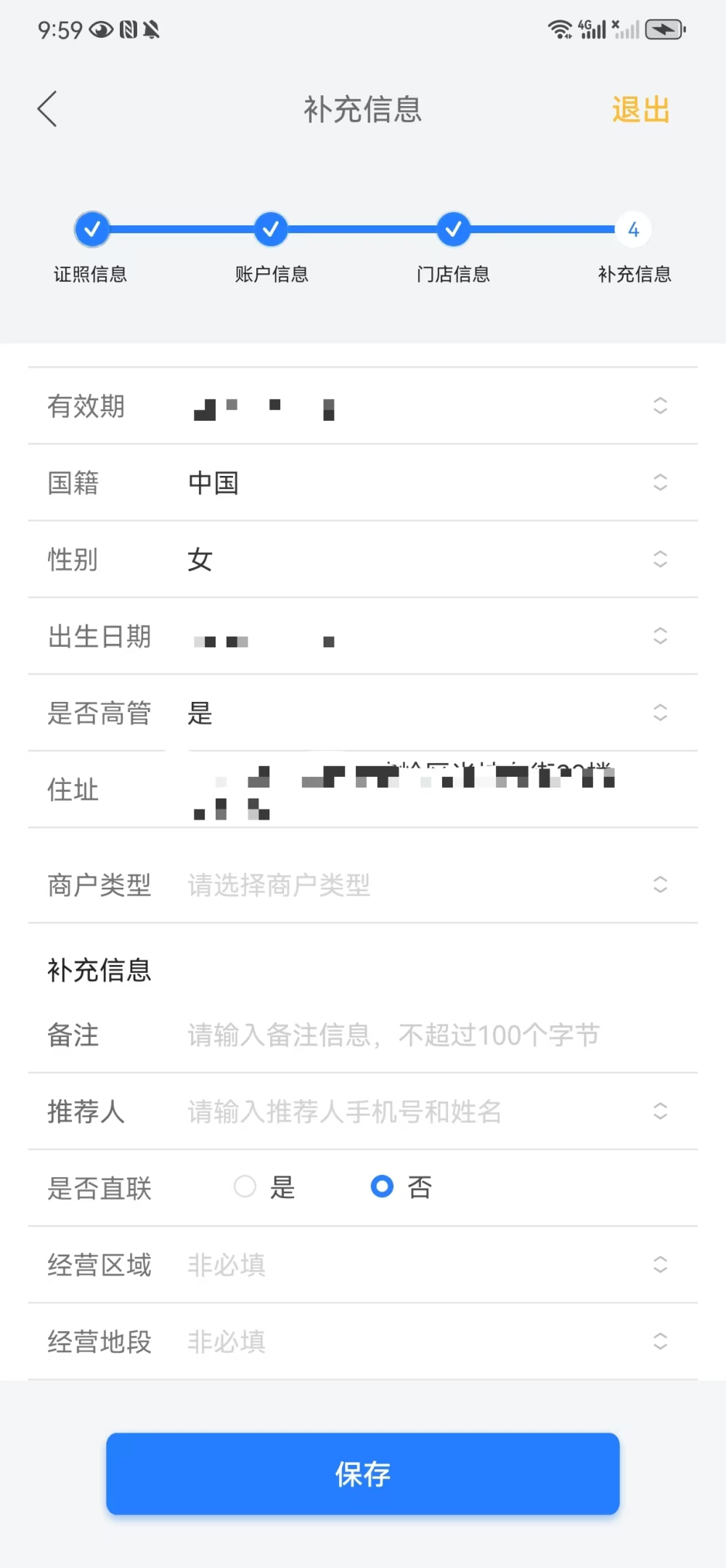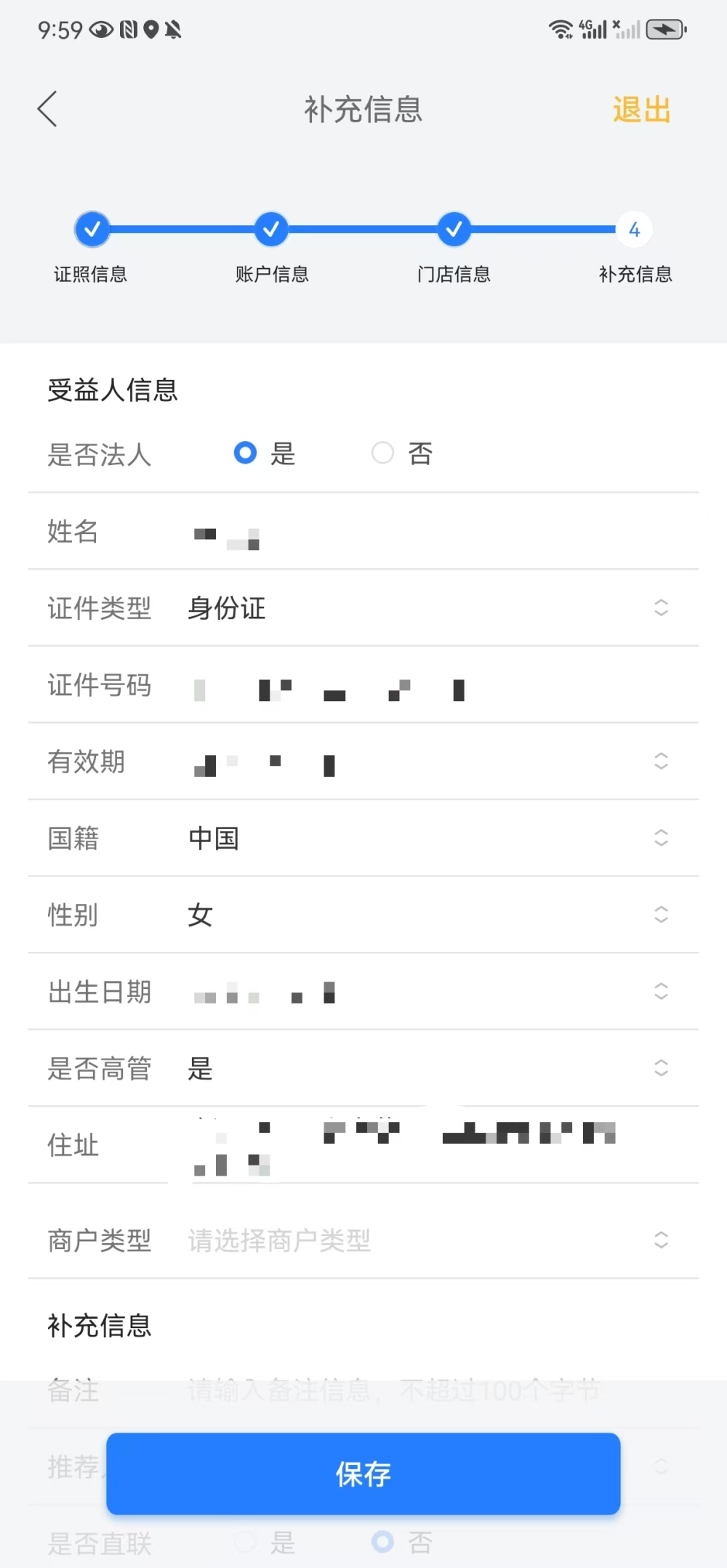 当照片识别失败或者大量信息缺失的时候,可以人工进行修改。务必保证填写信息与实际信息一致,修改的结果与证件照片实际信息不一致的商户将无法进行正常收款。