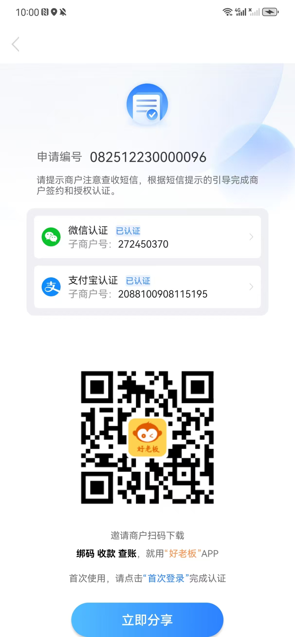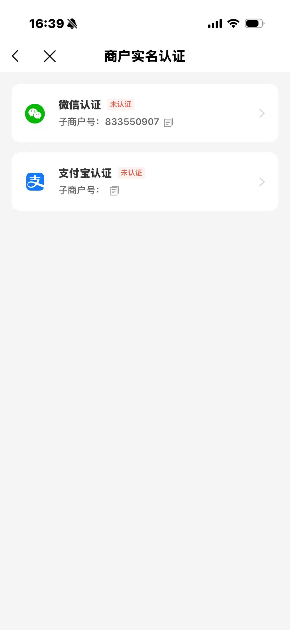 完成所有资料提交后,系统会返回进件提交成功,等待商户号申请成功后,会弹出微信认证和支付宝认证的标识。