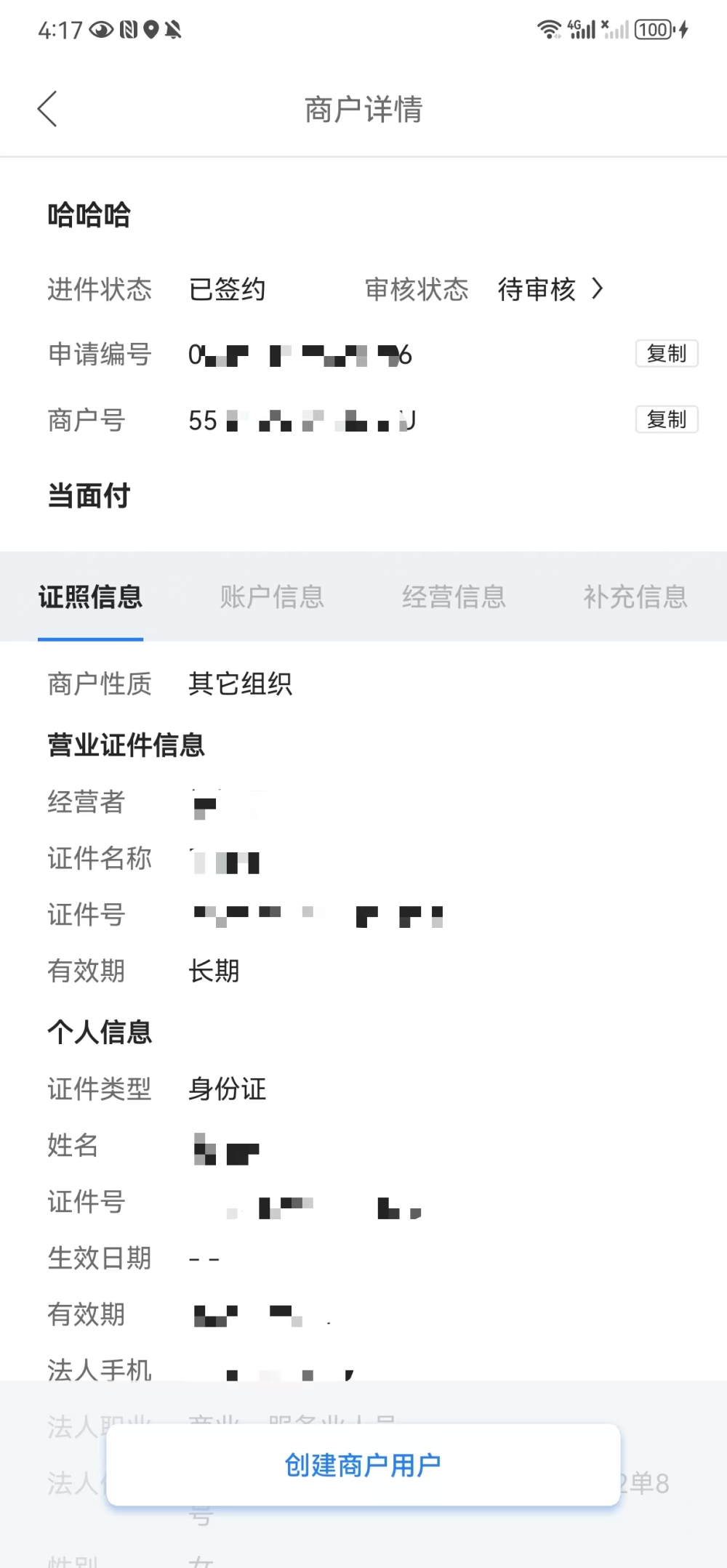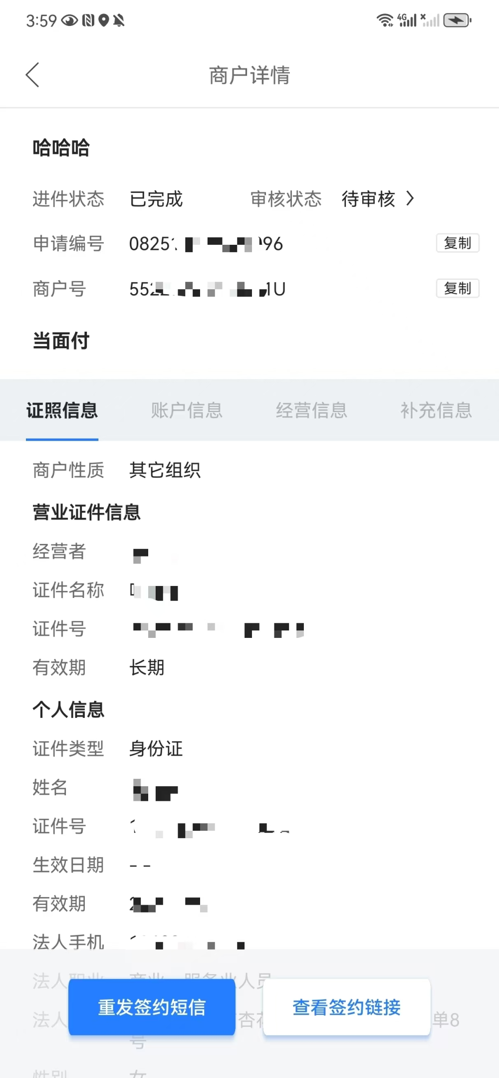 通联小伙伴对商户资料会做严格的系统校验,营业执照的经营者或法定代表人与上传的身份证的姓名证件号不一致,无法通过验证并提交入网申请。