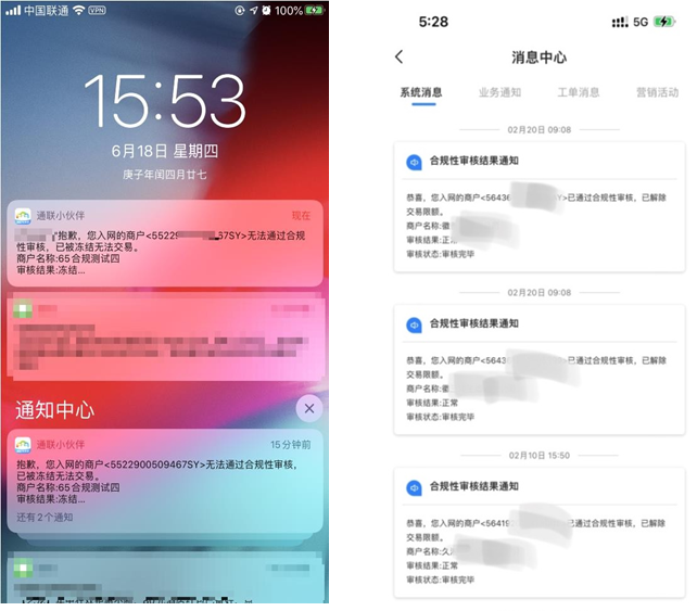 运营人员完成审核后,系统会推送消息通知至拓展人手机。同时小伙伴APP的商户管理中的消息中心也会有对应的数字标记,提示有新的合规性审核结果。