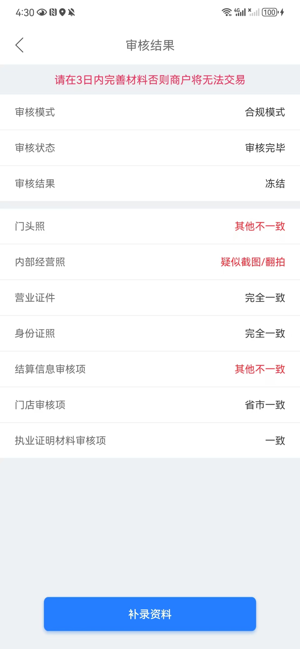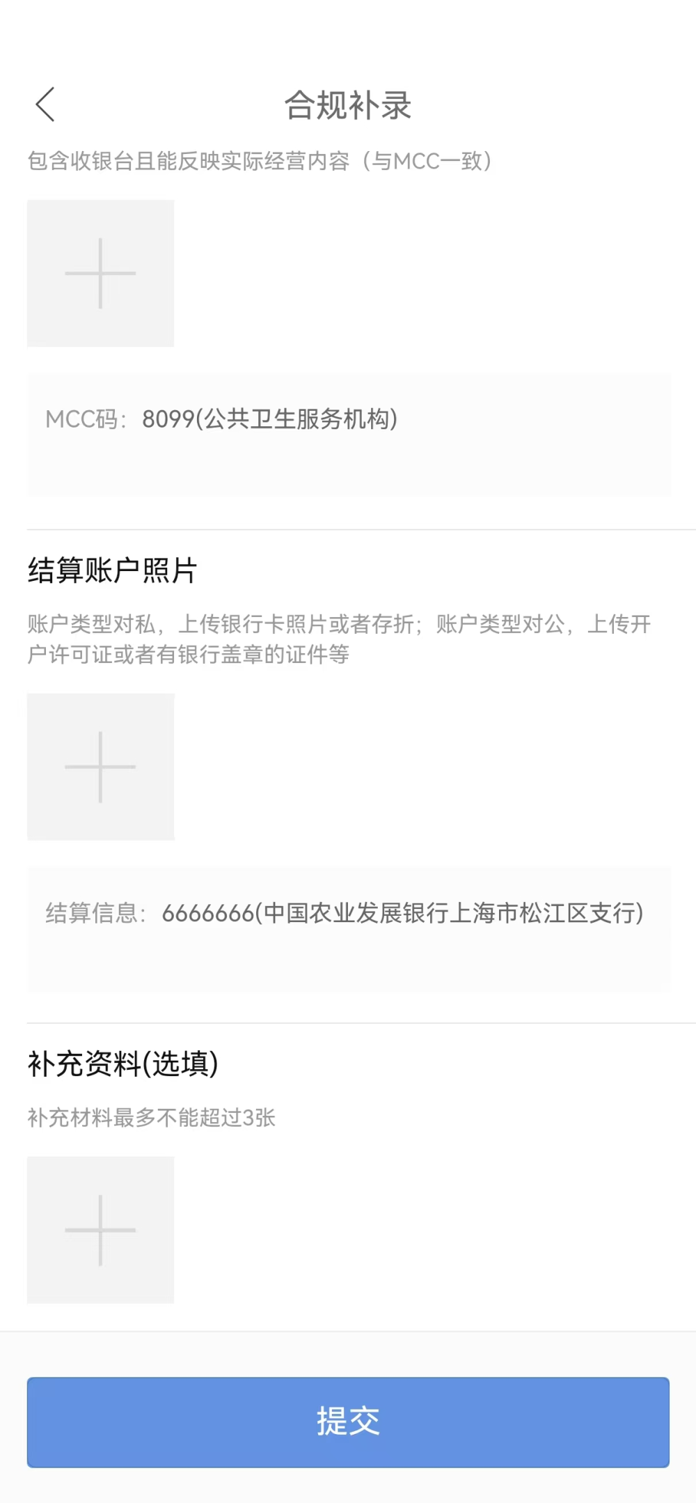 可以通过“商户详情”或者“合规审核详情”界面底部的【补录资料】按钮进入合规资料补录界面。根据界面提示的输入项,重新提交不符合要求的资料。