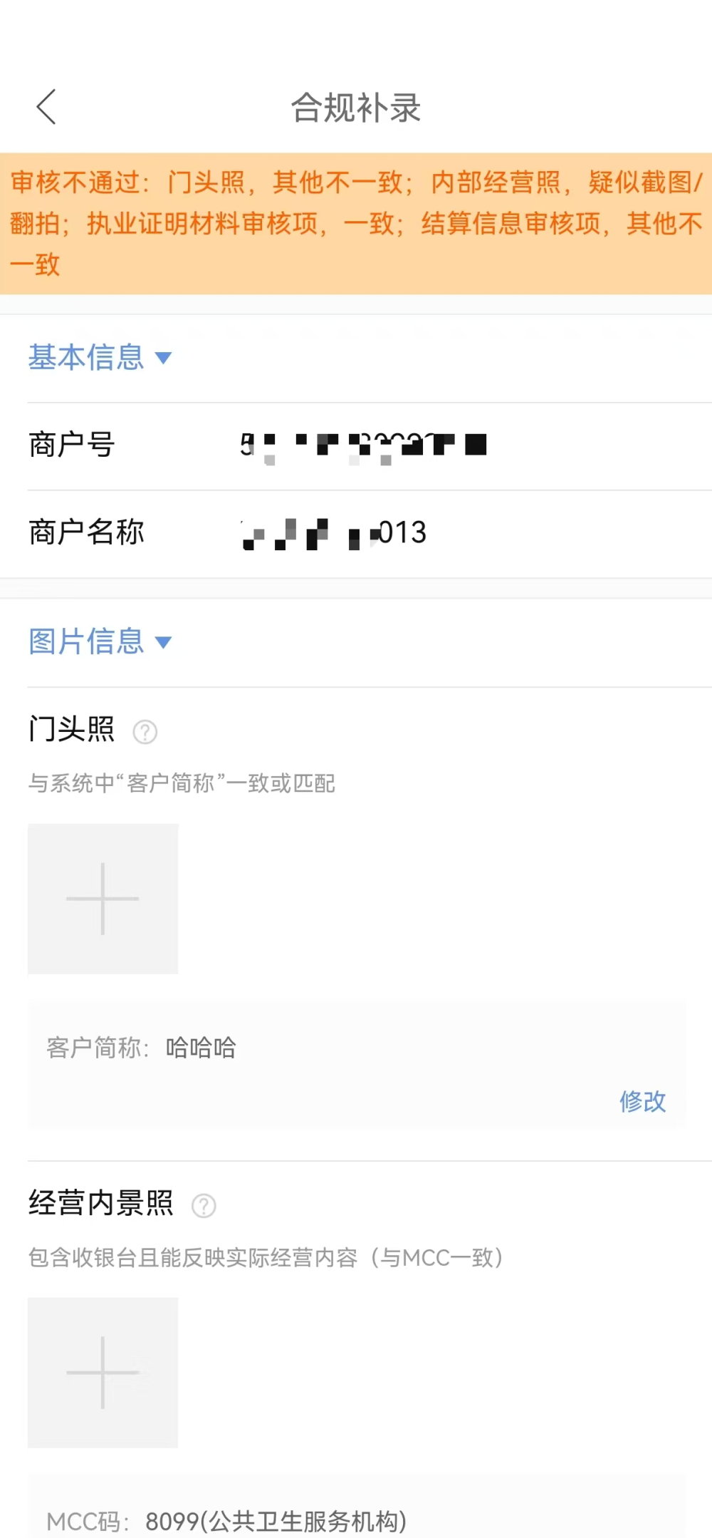 - 商户简称:基本信息中填写的商户简称,这里可以进行修改。需要注意必须和商户的门头照上的信息保持一致。