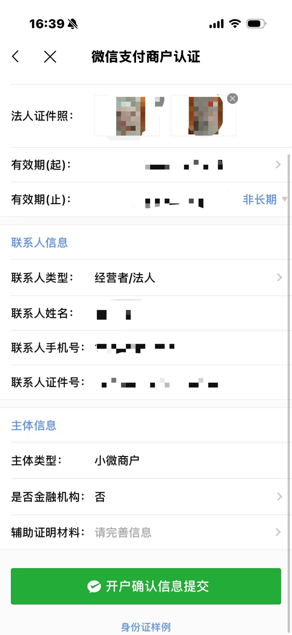 - 注1:有营业执照的商户,上传的证件信息必须是营业执照上的法定代表人或者经营者,否则无法通过系统校验。