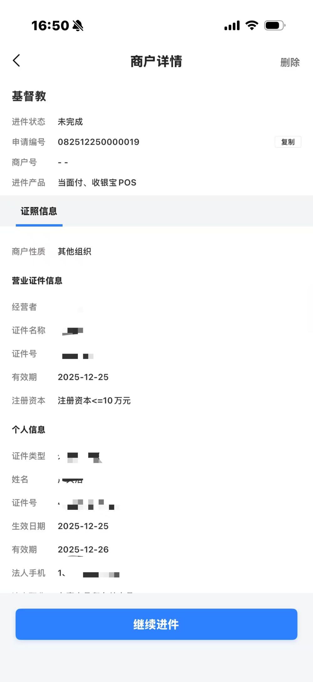 未完成的商户详情页底部提供“继续进件”入口,可以从中断的步骤继续完成进件。