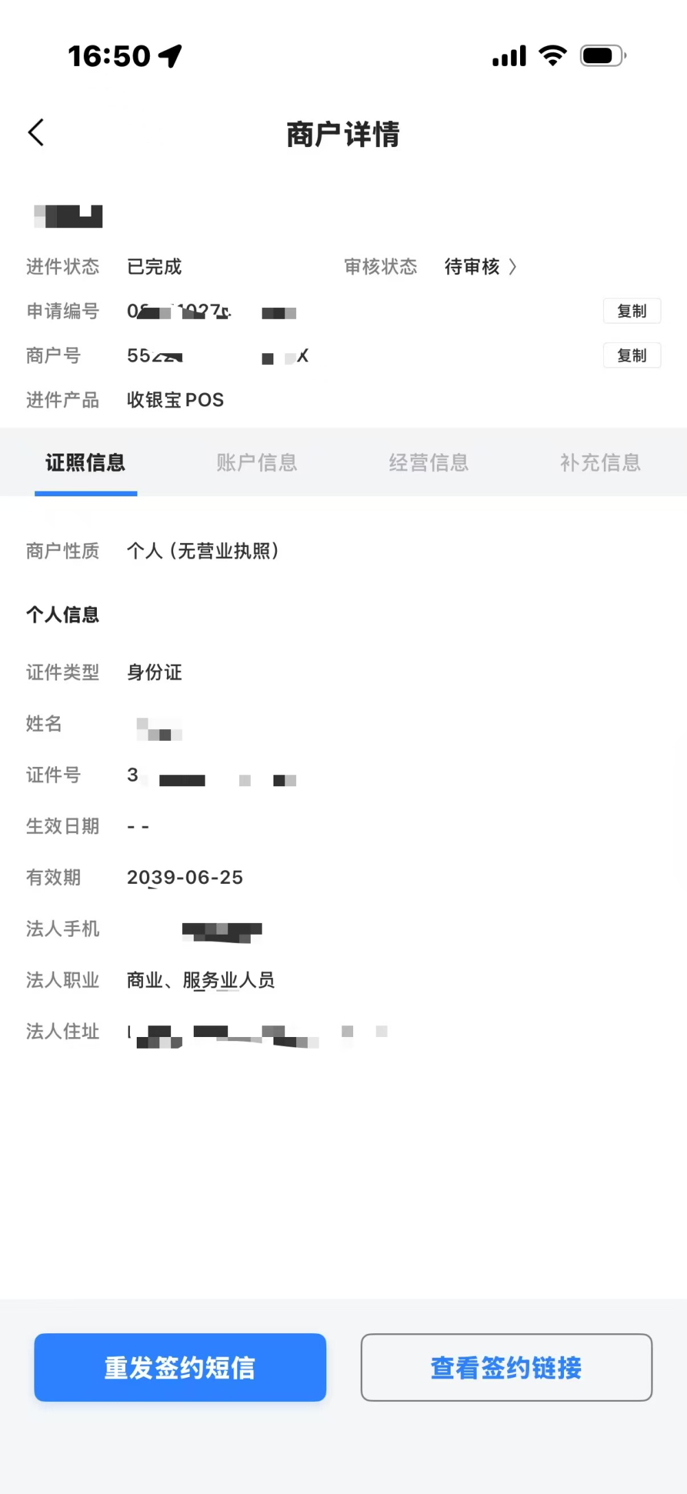 已完成状态的商户详情底部提供“重发签约短信”或“查看签约链接”两个按钮供客户经理辅助商户完成签约。