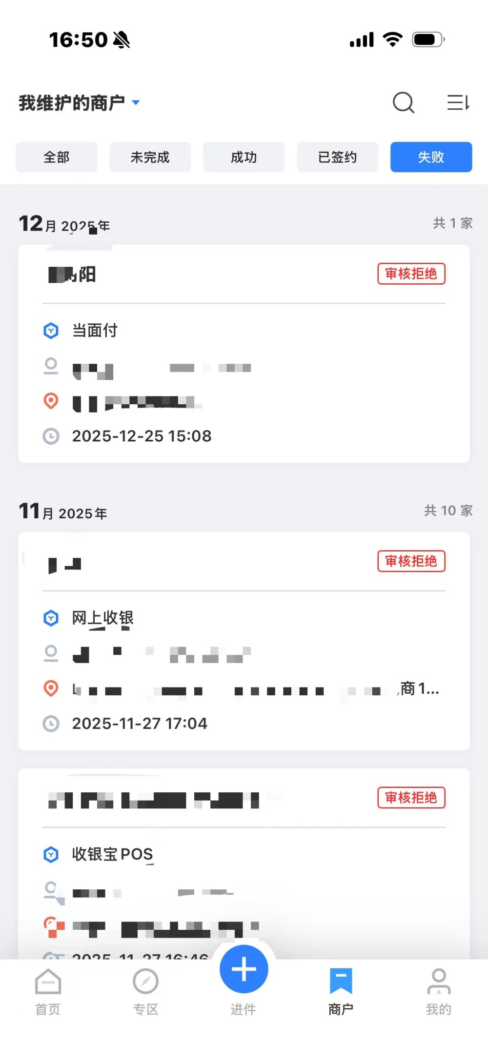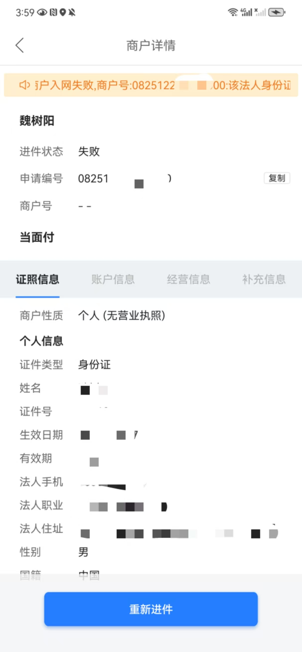 失败——提交进件申请后,审核失败的商户。商户详情界面顶部显示具体的入网失败原因。可根据具体原因修改资料后重新进件或放弃该商户。