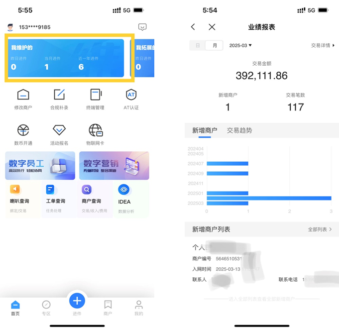 拓展人可实时查询其拓展客户的业绩情况,查询范围包含昨日数据、当日数据、上月数据。